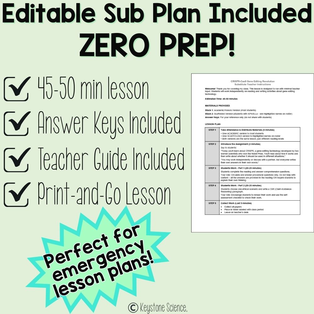 Need a reliable, standards-aligned lesson for when you're out? Looking for an engaging Women's History Month activity that connects to real-world science? This CRISPR-Cas9 sub plan has you covered — no teacher prep required!